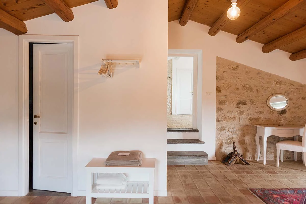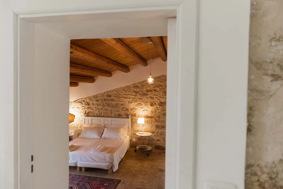 La Deluxe Botanica deve il proprio fascino alla sapiente narrazione fatta dalla luce che permea dalle finestre basse e che offrono una vista unica sui monti Iblei e sui vigneti. Ampia, di circa 42 mq, accoglie i propri ospiti al primo piano, in un unico ambiente con una zona living e un soffitto alto inclinato con travi a vista in legno naturale. Il pavimento artigianale realizzato in cotto amplifica la luce naturale.