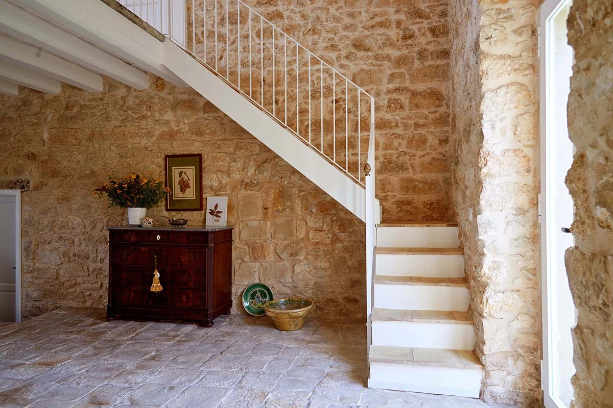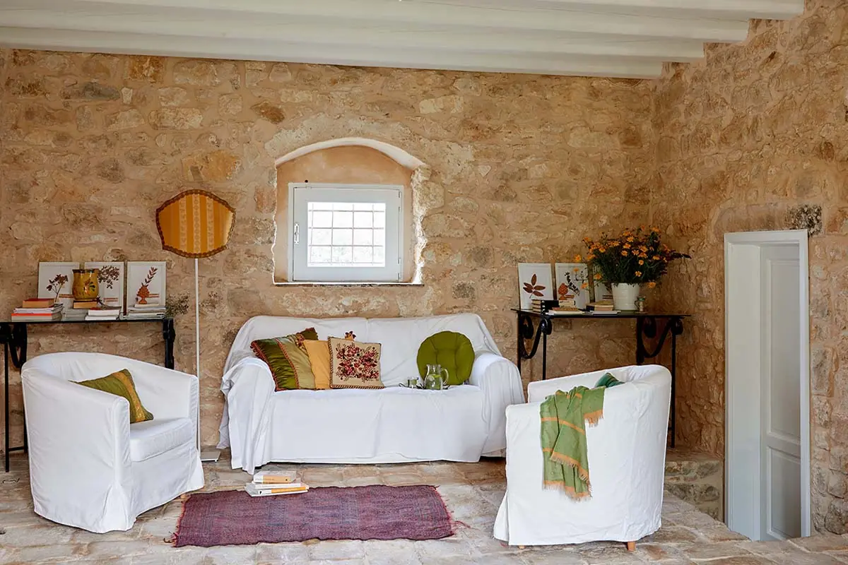 La sala da bagno, realizzata in malta bianca per esaltare la parete in pietra che diviene fondale naturale dell’ampia doccia a filo pavimento. In bagno, pregiate maioliche d’epoca della tradizione siciliana impreziosiscono l’ambiente e connotano l’identità della Deluxe. Per gli ospiti, la gradita sorpresa del sapone bio fatto in casa in esclusiva per Baglio Occhipinti.