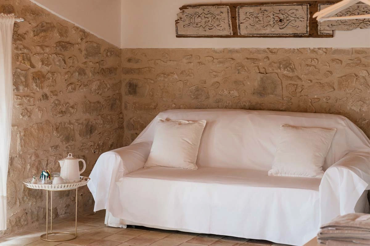 Letto queen size con doppi cuscini e un comodo divano letto possono ospitare anche una famiglia di quattro persone. La Deluxe viene personalizzata da tessuti pregiati color miele e da elementi di arredo unici come lo scrittoio d’epoca con specchiera e gli erbari realizzati con le essenze del Baglio dalla padrona di casa, Fausta Occhipinti.