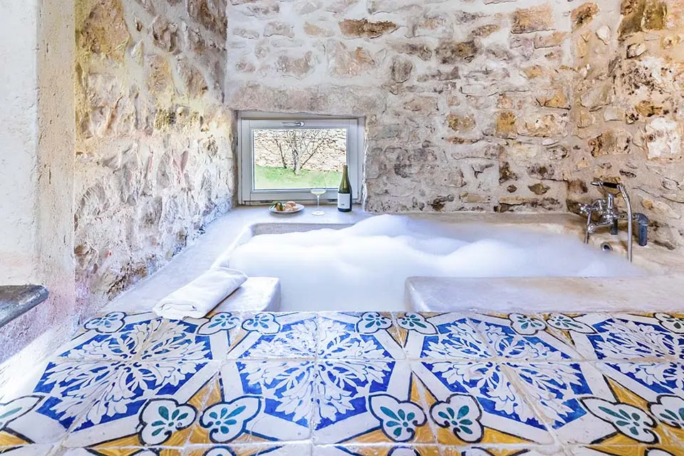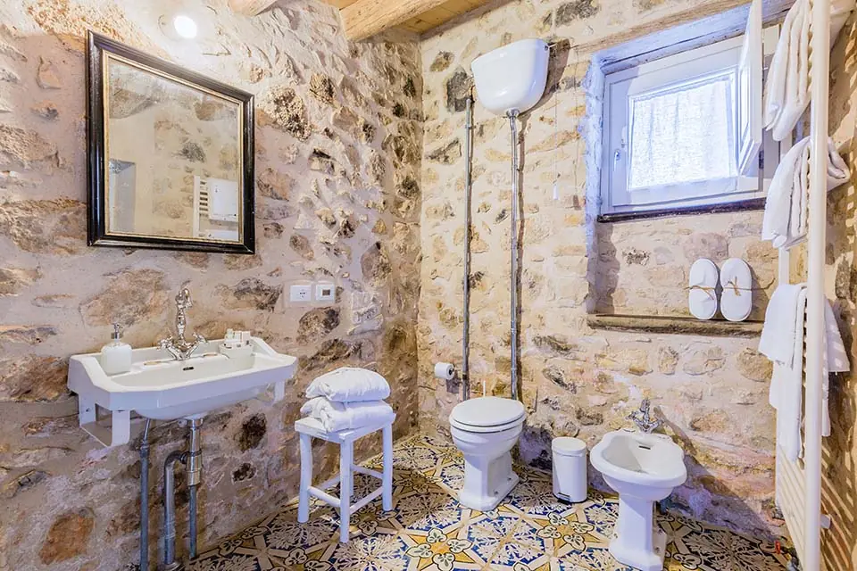 L’ampia sala da bagno, connotata dal pavimento in maioliche d’epoca, viene consacrata al romanticismo più passionale dalla vasca termale per due persone, ispirata alle terme romane, e dalla finestrella che consente di continuare ad ammirare il panorama del giardino privato. Per rendere la permanenza in vasca ancora più piacevole, per gli ospiti una selezione di sali e olii essenziali bio. Per gli ospiti, la gradita sorpresa del sapone bio fatto in casa in esclusiva per Baglio Occhipinti.